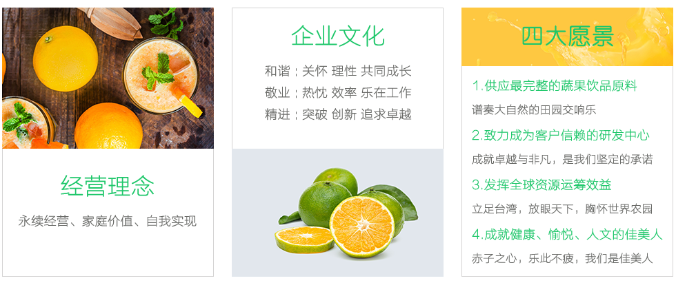 在公司發(fā)展壯大的13年里,我們始終為客戶提供好的產品和技術支持、健全的售后服務,不斷引進國外的先進技術和科學管理模式,逐步健全了與產品發(fā)展相適應的具有農產品加工特點的質量管理體系,全體職員本著“和諧、敬業(yè)、精進”的理念,竭誠為國內外的顧客提供最優(yōu)質的服務。我公司采用國內、外先進生產設備,年生產能力20000噸以上,主要產品包括:橙濃縮汁、蜜橘濃縮汁、柑橘原汁、檸檬原汁、血橙濃縮汁、芒果漿、橙果粒罐頭、橙瓣罐頭、白柚果粒罐頭、仙草凍罐頭、檸檬切片罐頭、速凍橙蓉、速凍檸檬蓉、速凍橙皮(丁、絲)、速凍檸檬皮(丁、絲)、蜜漬橙皮檸檬片、柚子等。南充佳美產品行銷覆蓋全國及遠銷海內外,是國內濃縮汁、原汁、及速凍產品行業(yè)規(guī)格最大、最具競爭力的企業(yè)之一,期待與您的合作。